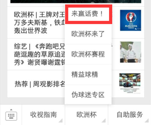 点击菜单【欧洲杯】-【来赢话费】,进入活动页面。