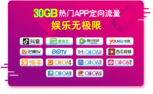 ② 每月30GB热门APP定向流量,包含爱奇艺、腾讯视频、优酷、抖音、咪咕视频、咪咕直播、咪咕动漫、咪咕游戏、咪咕阅读、咪咕音乐、芒果TV、PPTV、快手、西瓜视频14个热门APP。