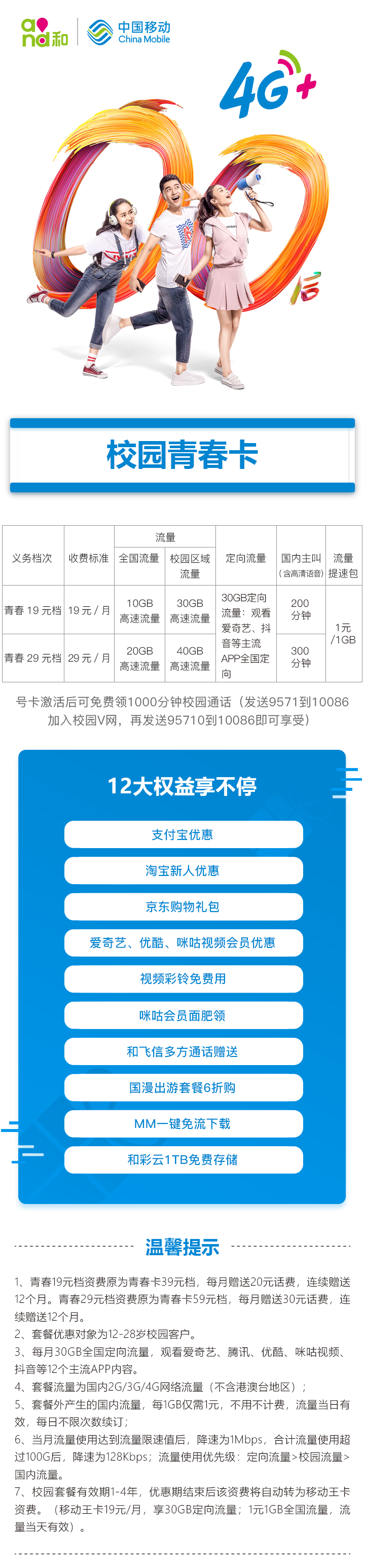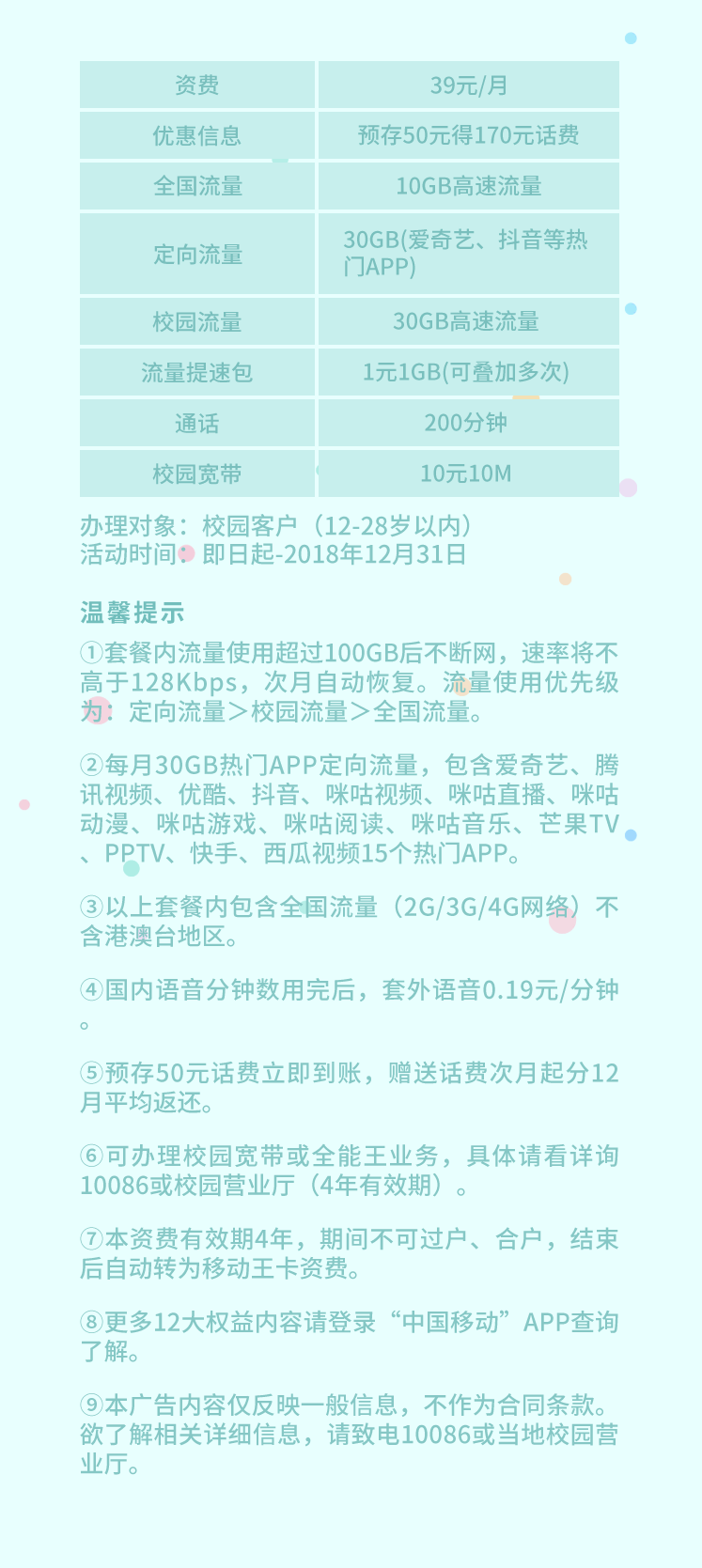 1、套餐优惠对象为12-28岁校园客户。